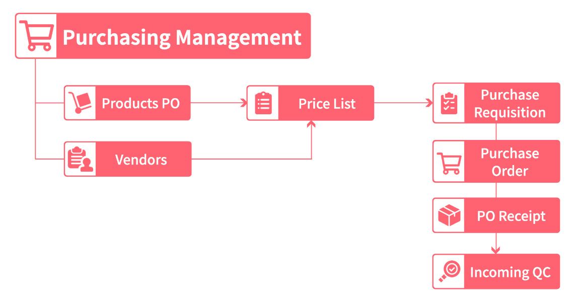 The Purchasing Management template is designed to manage vendor information, purchasing price, and the entire purchasing process. The purchasing process includes a purchase requisition completed by staff (and approval), a purchase order used by the procurement staff, and subsequent receipt and incoming quality control.