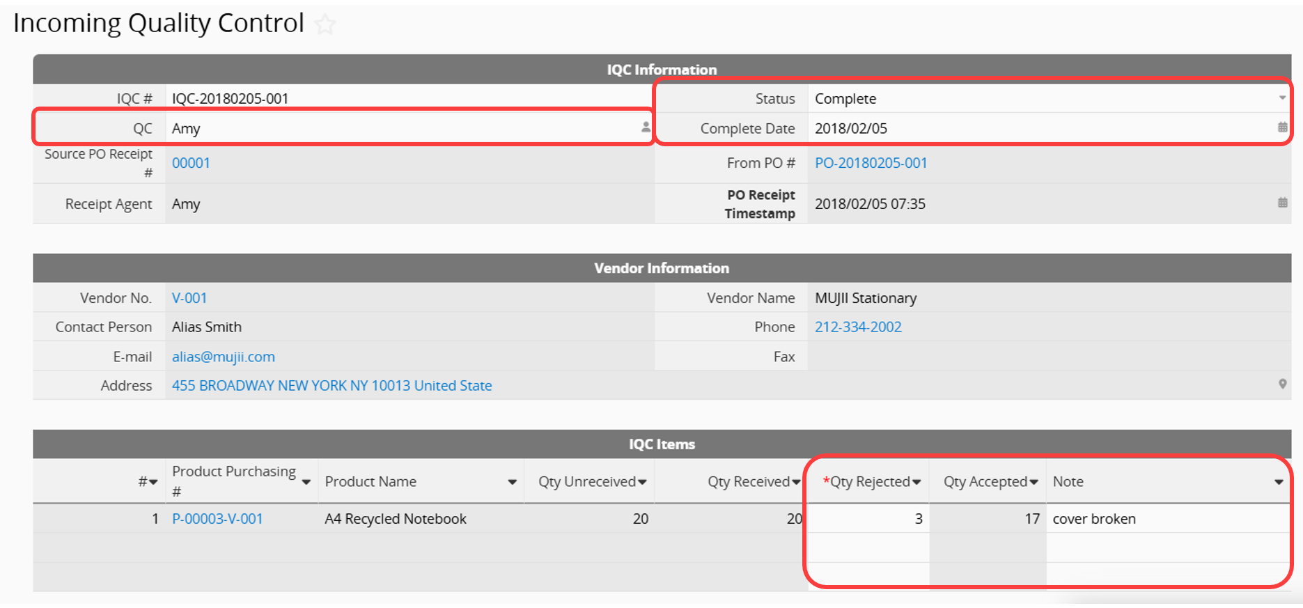 "IQC Items" Subtable: Be sure to fill in the Qty Rejected for each item in the Subtable (and verify that the Qty Accepted is correct). If there is any Qty Rejected, you can enter a Note.