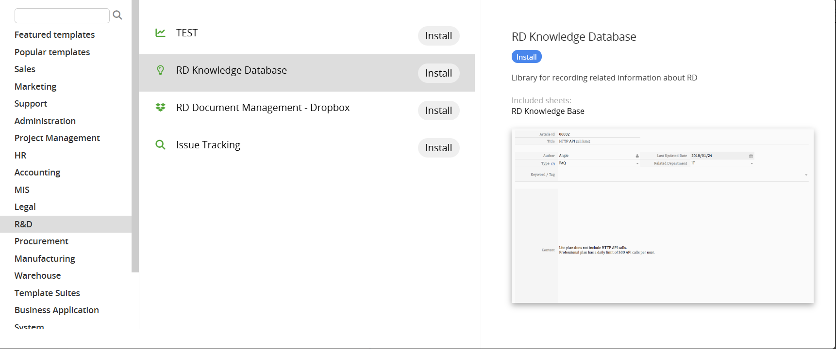 The "Knowledge Database" template can be used in various scenarios. In the Install Templates, you will find "Knowledge Database" templates under both the "Support" and "R&D" categories. You can choose either one and customize it for different departments or purposes.