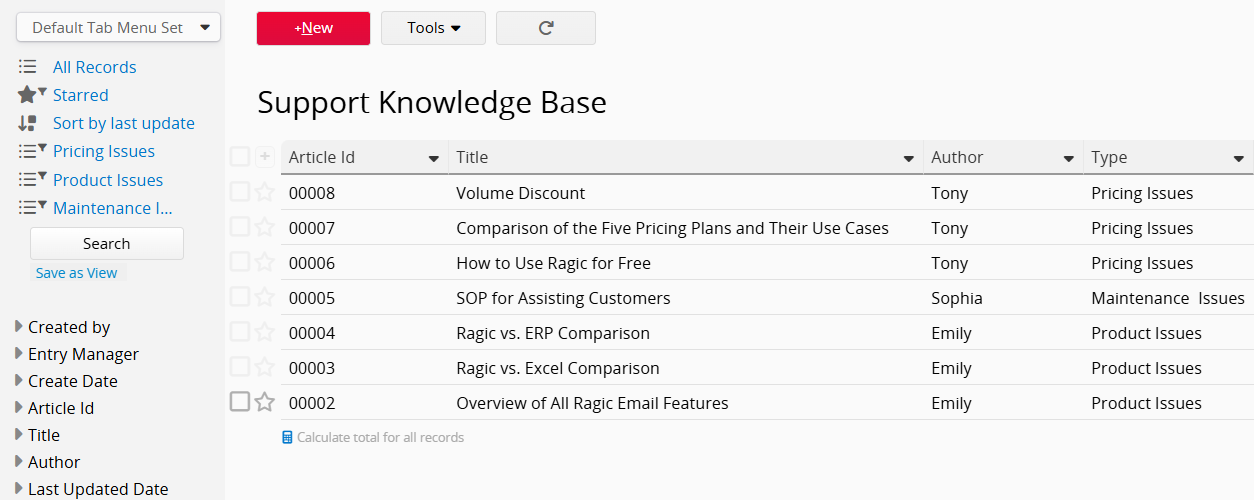 Ragic is an online tool that lets you build custom database applications without writing any code. It also offers a wide range of free templates you can install directly, including a "Knowledge Database" template.