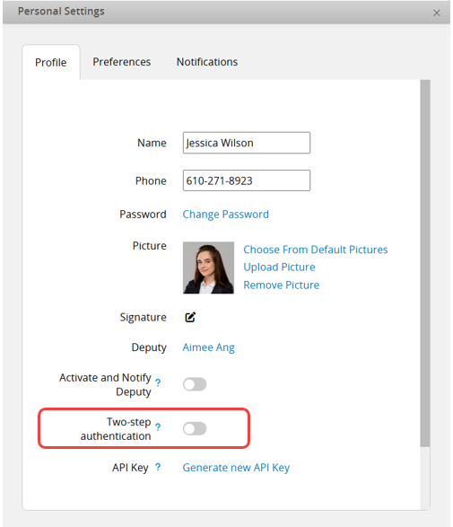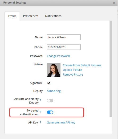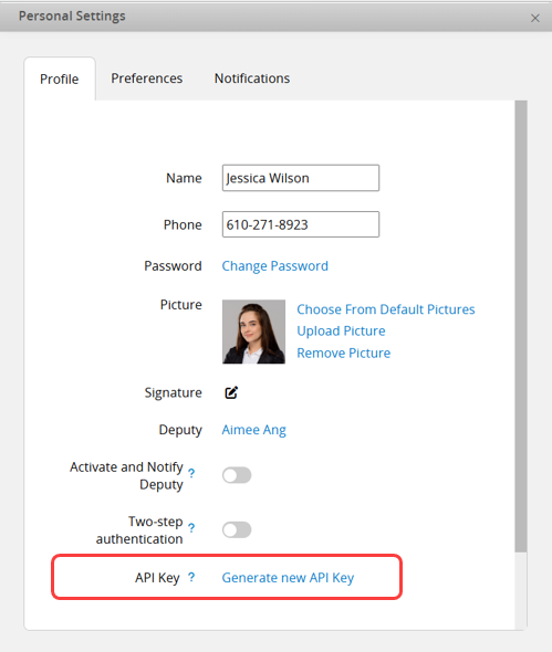 When the SYSAdmin integrates an API requiring access with your account permissions, your API Key is needed. In Profile, you can generate the API Key for the current user. Regenerating it will reset the previous key.