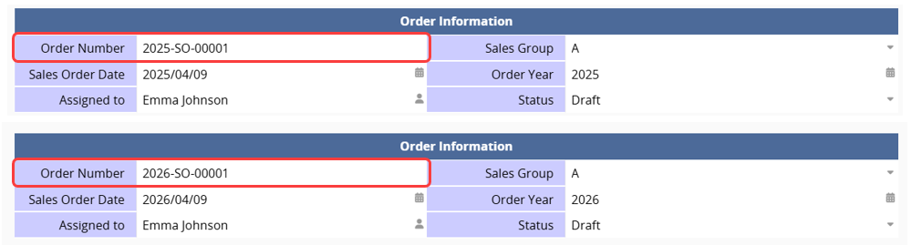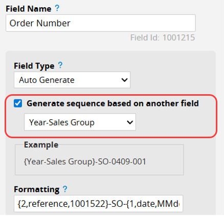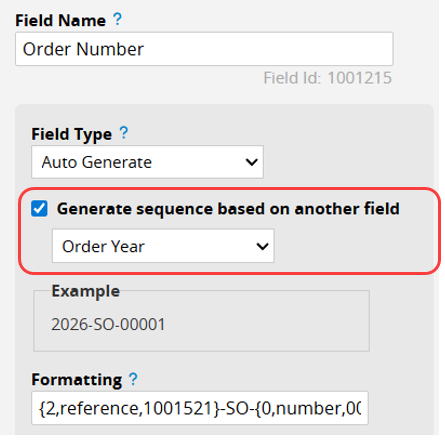For example, you can set the "Order Number" to generate sequence numbers based on the "Order Year" field.