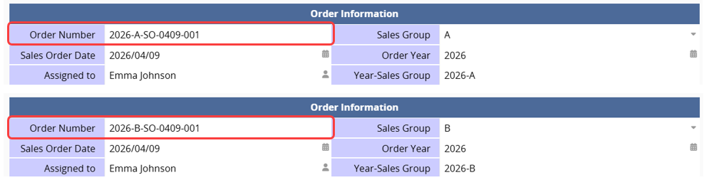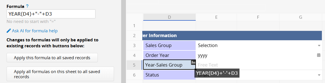 For example, there is a Free Text field that uses a formula to combine "Order Year" and "Sales Group" into "Year-Sales Group" (for example: "2026-A").