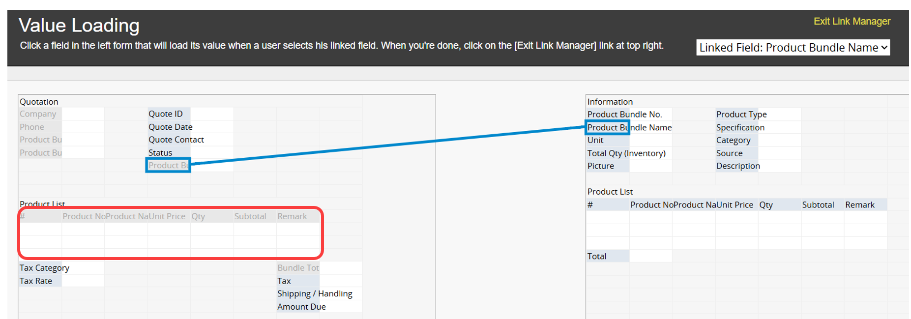 After linking to an independent field, you can choose to load all Subtable data from the source sheet. For example, in a "Product Bundle" sheet where the subtable lists individual products included in the bundle, when adding a product bundle to a "Quotation" sheet, you can use a Linked Field to load all product details from the subtable without manually selecting each product.