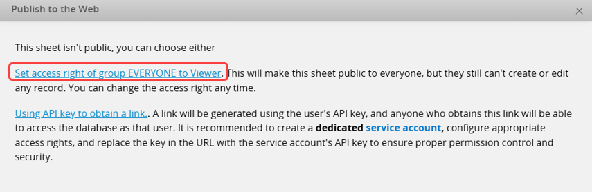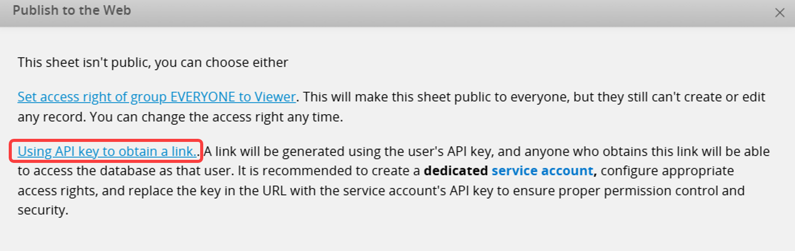 Anyone with the link can access the database with the same rights as the user who generated the API Key. Therefore, it is recommended to create a dedicated Service Account, configure appropriate Access Rights, and replace the key in the URL with the Service Account's API key to ensure proper permission control and security.