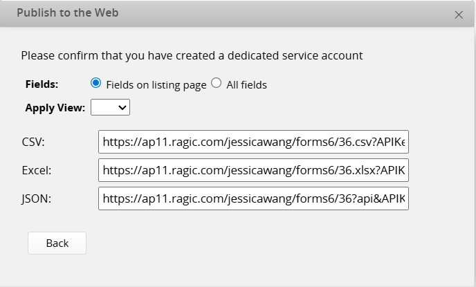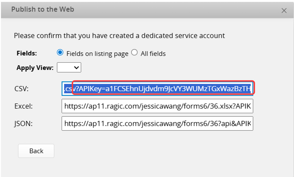 If you are not using a Service Account and need to use an API key from a different account, log in to that account first and follow the instructions in this section to obtain the API key. Once obtained, append it to the URL after APIKey=.