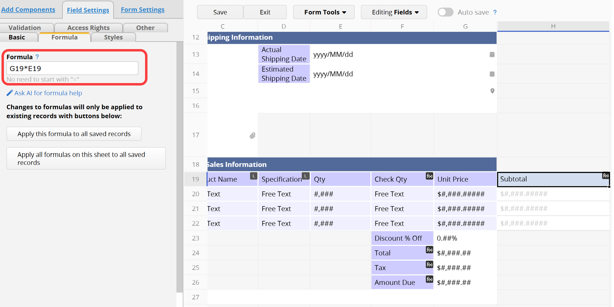 The Formula feature is used to perform data calculations, similar to Excel functions. However, Ragic uses its own formulas, so the supported functions may differ from Excel. Notably, formulas in Ragic reference the position of field headers directly. In Design Mode, you can set up a formula by selecting the target field header and choosing Formula from the left-side panel.