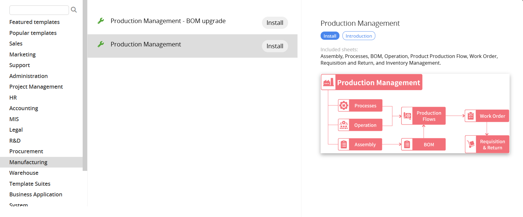 If you are already a Ragic user, you can find the "Production Management" template under the "Manufacturing" category in Install Templates and click "Install" to download it.